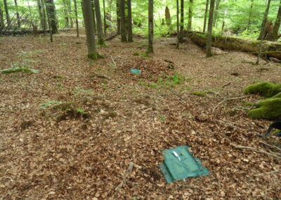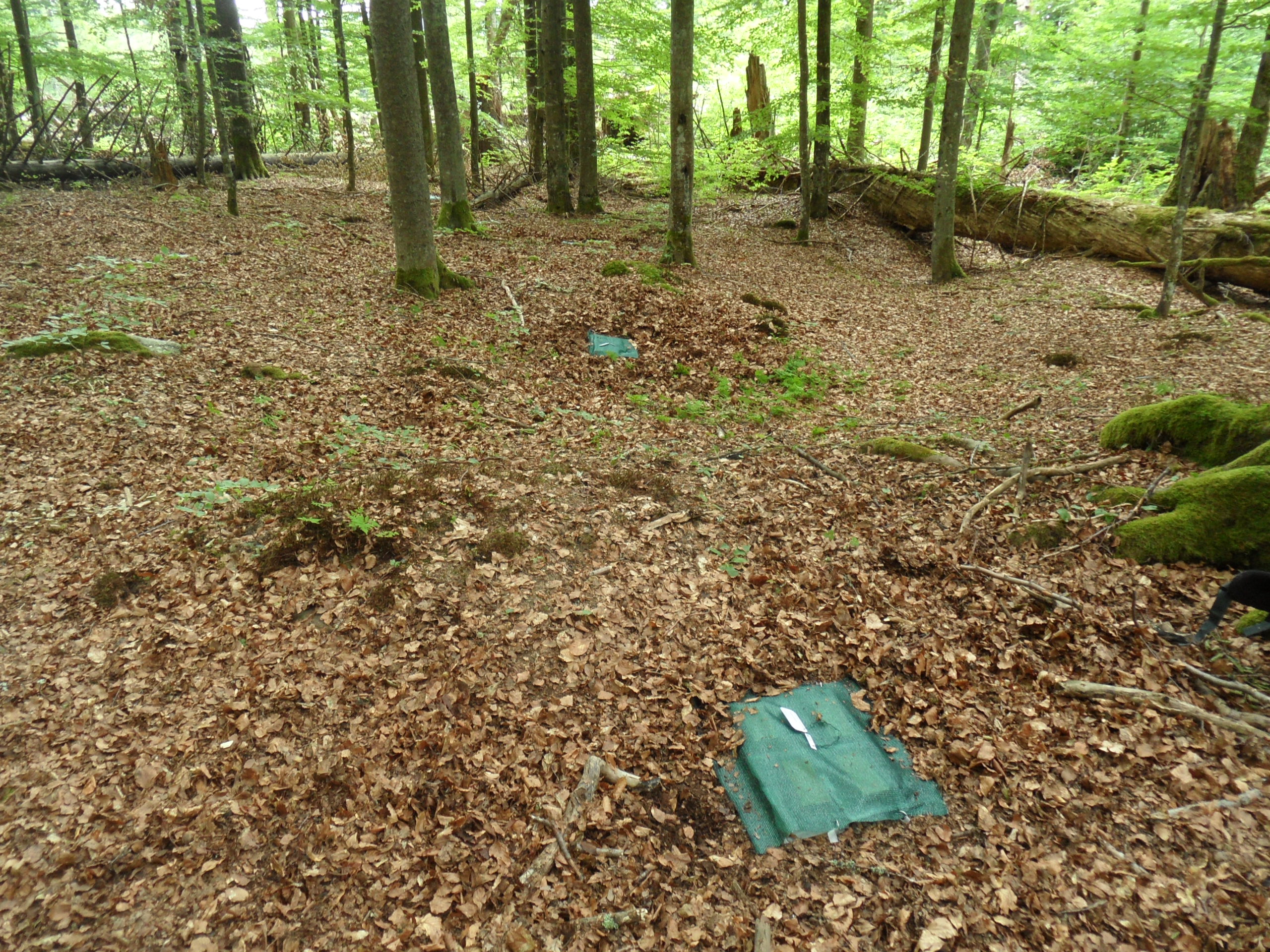 Obrázek: Fotografie z počátku terénního dekompozičního experimentu v Žofínském pralese. Bločky dřeva jsou překryty stínící sítí pro odklonění vlivu slunečního záření a u poloviny počtu bločků je nylonovou sítí zamezen přístup hmyzu.